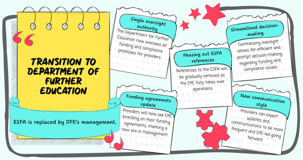 - Providers will see DfE branding on funding agreements and guidance (ESFA references are being phased out).
